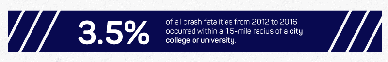 Between 2012 and 2016, 4.3 percent of all crash fatalities occurred within a three-mile radius of a non-city college or university. City colleges and universities were only slightly safer. During the same period, 3.5 percent of crash fatalities occurred within a 1.5-mile radius of city colleges and universities.