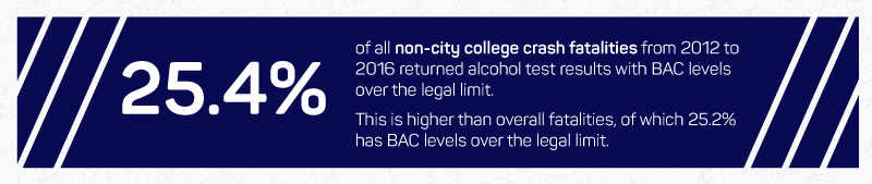 Between 2012 and 2016, more than 1 in 4 crash fatalities at non-city colleges and universities involved a driver with a BAC level over the legal limit. These deadly alcohol-related accidents were even more common at city colleges. Over the same four-year time span, more than 28 percent of crash fatalities involved a driver with a BAC over the legal limit of .08.